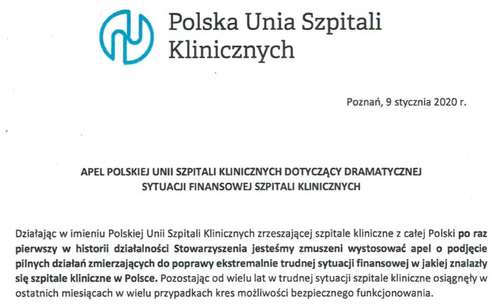 W związku z prośbą Przewodniczącego Polskiej Unii Szpitali Klinicznych, skierowaną do Dyrekcji SPSK1, publikujemy informację o apelu PUSK, dotyczącą ekstremalnie trudnej sytuacji finansowej, w jakiej znalazły się szpitale kliniczne w Polsce.