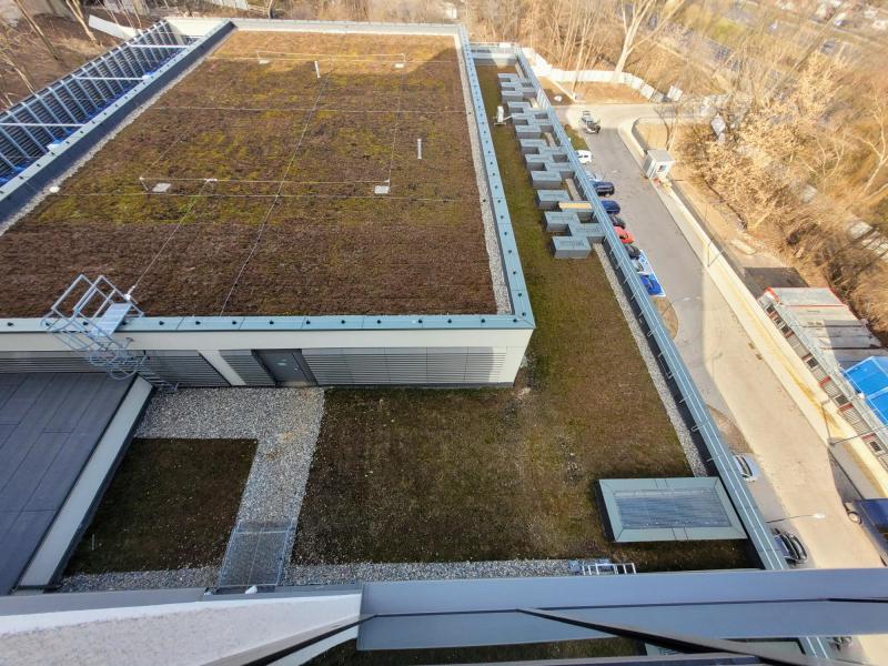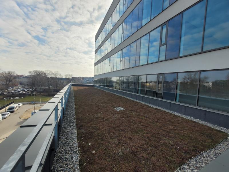 Nowy budynek Samodzielnego Publicznego Szpitala Klinicznego Nr 1 wielokrotnie prezentowaliśmy już na stronie internetowej, informacje o nim i liczne galerie zdjęć można znaleźć również w mediach. Dziś publikujemy zdjęcia dachu najbardziej okazałego obiektu Szpitala, który został zrealizowany w oparciu o innowacyjne i proekologiczne trendy. Stojąc na chodniku lub przejeżdżając ulicą Staszica nie możemy dostrzec prawie 3000 m kw. zielonej powierzchni - dach budynku pokrywa bowiem tzw. warstwa wegetacyjna z zielenią ekstensywną. W praktyce oznacza to, że dzięki naszej inwestycji w tej lokalizacji, Lublin zyskał w ścisłym centrum sporej wielkości trawnik, choć w nietypowym miejscu i rzadko spotykanej formie. Zdjęcia wykonano w środku zimy (23. lutego), wiosną i latem dach będzie prawdziwie zielony...
