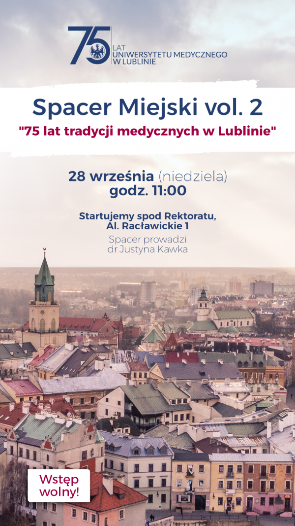 Z okazji 75-lecia Uniwersytetu Medycznego w Lublinie serdecznie zapraszamy na wyjątkowy spacer miejski, który będzie nie tylko okazją do przechadzki ulicami miasta, lecz przede wszystkim wędrówką przez historię.