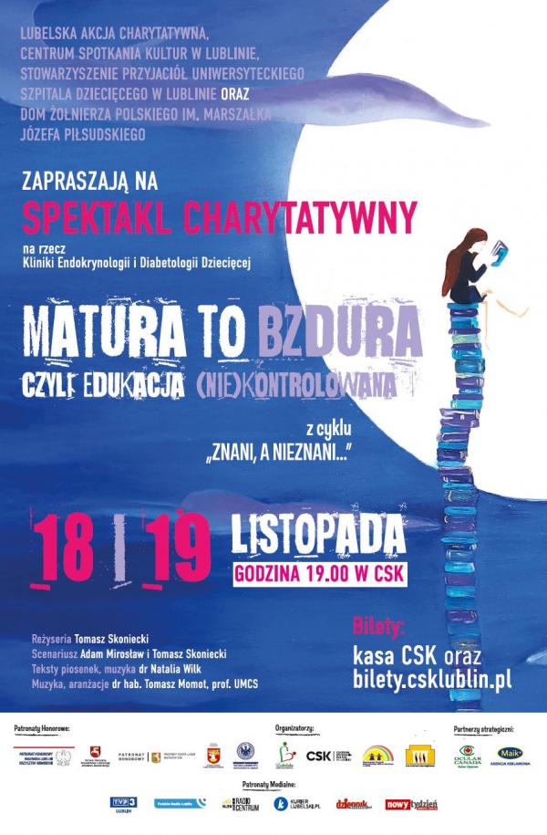 Uniwersytecki Szpital Dziecięcy zaprasza na spektakl organizowany we współpracy z Lubelską Akcją Charytatywną i Centrum Spotkania Kultur w Lublinie pt. „Matura to bzdura - czyli edukacja (nie)kontrolowana”. Wydarzenie odbędzie się w dniach 18.11.2025 r. i 19.11.2025 r. w Centrum Spotkania Kultur w Lublinie.