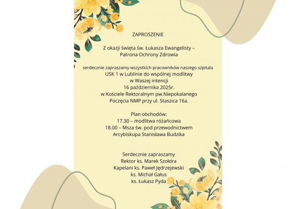 Z okazji Dnia św. Łukasza Ewangelisty - patrona lekarzy i wszystkich pracowników ochrony zdrowia, serdecznie zapraszamy 16 października do wspólnej modlitwy w Kościele Rektoralnym pw.Niepokalanego Poczęcia NMP przy ul. Staszica 16a.