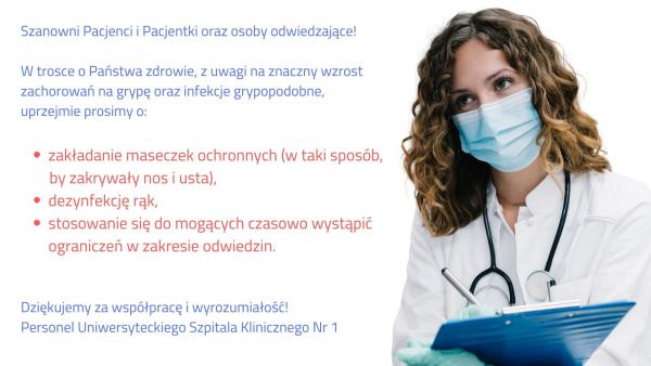 Z powodu wzrostu zachorowań na grypę i infekcje grypopodobne, uprzejmie prosimy o zakładanie na terenie szpitala maseczek ochronnych oraz częste dezynfekowanie rąk. Informujemy również, że w zależności od sytuacji epidemiologicznej w danej jednostce, mogą występować czasowe ograniczenia w zakresie odwiedzin u pacjentów.