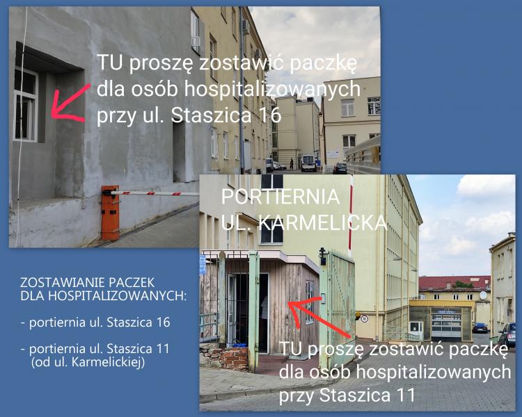 2. Dla pacjentów hospitalizowanych w Klinikach po stronie ulicy Staszica 11 - paczki zostawiamy na portierni od strony ul. Karmelickiej (kiosk przy szlabanie).
