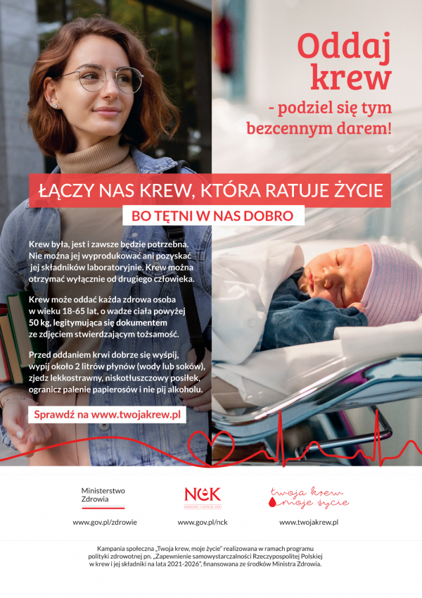 Regionalne Centrum Krwiodawstwa i Krwiolecznictwa w Lublinie zachęca do honorowego oddawania krwi - informacje na temat kampanii społecznej "Twoja krew, moje życie" dostępne są na stronie internetowej twojakrew.pl.