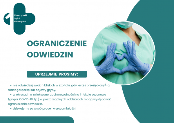 Informujemy, iż ze względu na zwiększoną zachorowalność na infekcje wirusowe, w tym COVID-19, w Klinice Hematoonkologii i Transplantacji Szpiku USK 1 wprowadzono ograniczenie odwiedzin. W wyjątkowych sytuacjach odwiedziny są możliwe wyłącznie za zgoda lekarza prowadzącego lub lekarza dyżurnego.
