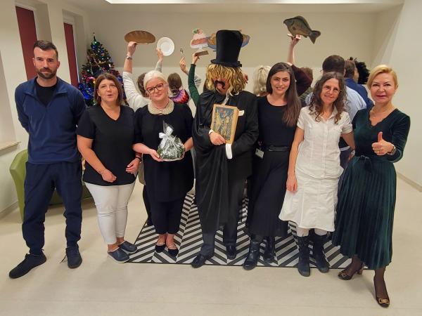 Aktorzy - pacjentki i pacjenci Oddziału Dziennego Psychiatrycznego, długo przygotowywali się do tego występu pod okiem terapeutek zajęciowych: reżyserki przedstawienia - Karoliny Sykut, zajmującej się teatroterapią oraz Magdaleny Semeniuk. Słowa uznania należą się zarówno występującym, jak również Pani reżyser, za stworzenie bardzo wzruszającej i ciepłej, przedświątecznej aury. Widzowie nagrodzili twórców gromkimi brawami. Na zdjęciu personel Kliniki, w tle występujący w przedstawieniu pacjenci.