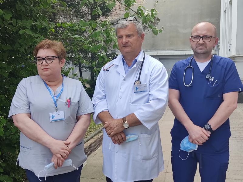 Na zdjęciu: lekarze z Kliniki podczas briefingu prasowego: Profesor Marek Hus - Kierownik Kliniki oraz dr n.med. Dorota Hawrylecka i dr n.med. Tomasz Gromek (fot. A.Guzowska)