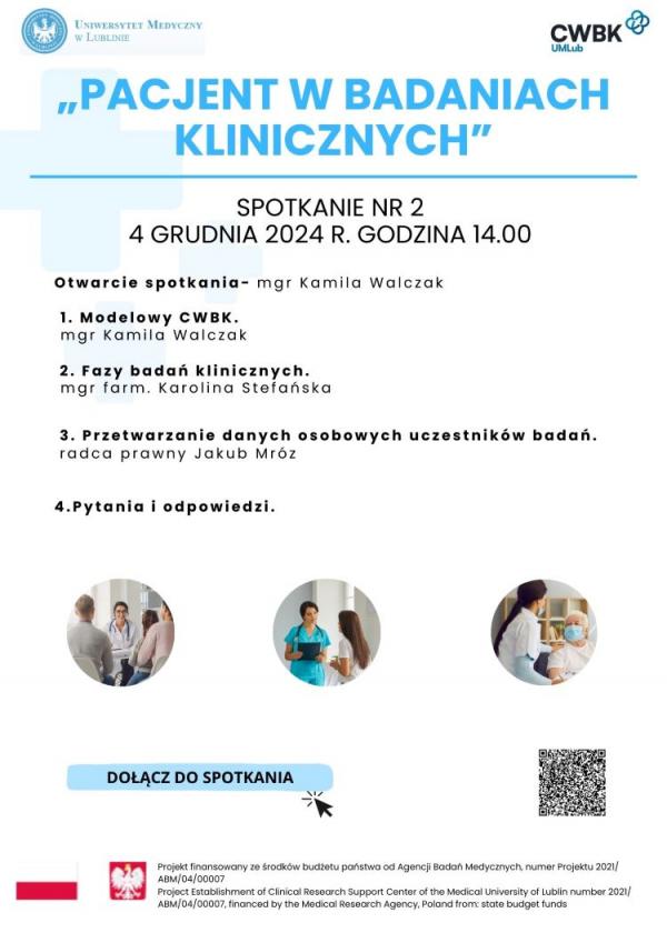 W imieniu Centrum Wsparcia Badań Klinicznych Uniwersytetu Medycznego w Lublinie zapraszamy do udziału (online) w szkoleniu "Pacjent w badaniach klinicznych" - część II: