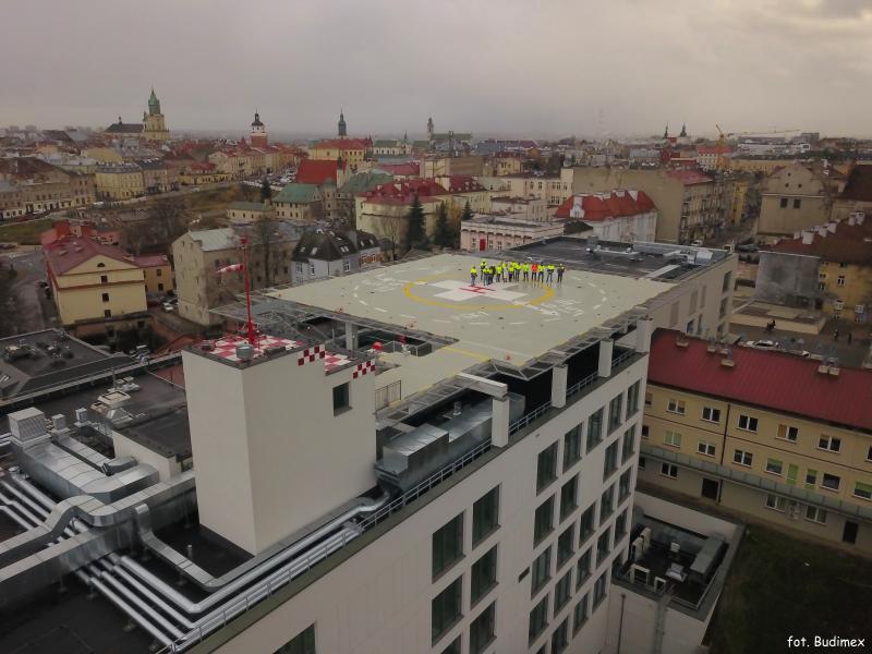 Zdjęcie tytułowe przedstawia kadrę zarządzającą firmy Budimex (wykonawcy inwestycji) na lądowisku dla helikopterów po zakończonych odbiorach budynku.