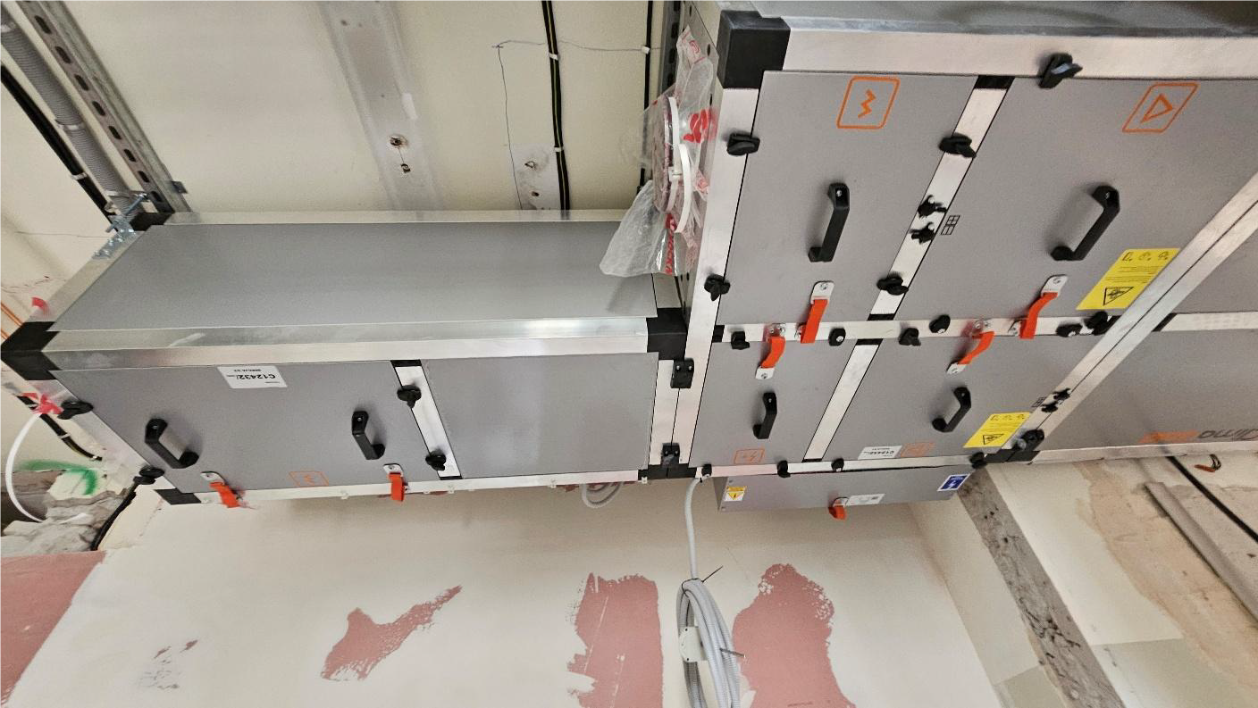 Postępowały także prace instalacyjne. W zakresie instalacji elektrycznych kontynuowano montaż tras kablowych oraz prowadzenie okablowania. W ramach instalacji sanitarnych przeprowadzono próby szczelności instalacji wodno-kanalizacyjnej oraz centralnego ogrzewania. Równolegle realizowano montaż urządzeń wentylacyjnych wraz z podłączeniem kanałów.