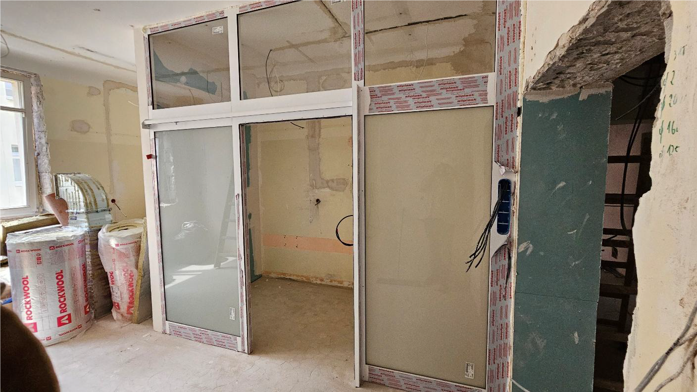 W maju kontynuowano prace budowlano-instalacyjne w ramach realizacji projektu współfinansowanego z programu Interreg. W zakresie robót budowlanych prowadzone były prace tynkarskie wewnątrz obiektu, zamontowano część drzwi oraz aluminiowych ścianek działowych. Dostarczono również stolarkę okienną i rozpoczęto jej montaż.